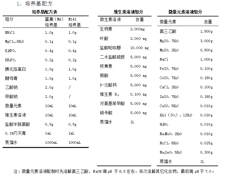 NH4Cl、MgCl2·6H2O、K2HPO4、KH2PO4、甲酸鈉、乙酸鈉、胰化酪蛋白、酵母膏、鹽酸半胱氨酸、刃天青、Na2S·9H2O、NaHCO3、氨三乙酸、MgSO4·7H2O、MnSO4·2H2O、NaCl、FeSO4·7H2O、CoSO4·7H2O、CaCl2·2H2O、ZnSO4·7H2O、KAl(SO4)2·12H2O、CuSO4·5H2O、H3BO3、Na2MoO4·2H2O、NiCl2·6H2O、Na2SeO3·5H2O、生物素、葉酸、鹽酸吡哆醇、二水鹽酸硫胺、核黃素、煙酸、D-泛酸鈣、維生素B12、對(duì)氨基苯甲酸、硫辛酸。