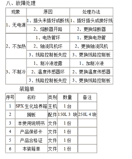 5、為了保持設(shè)備的美觀,請不要用酸或堿及其他有腐蝕性物品來擦表面,箱內(nèi)可以用布定期擦凈。 八、故障處理